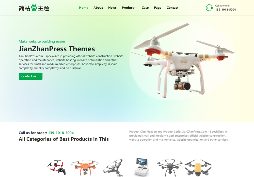 首屏渐变色背景、绿色风格的wordpress主题,适合做无人机的外贸公司建B2B网站使用。